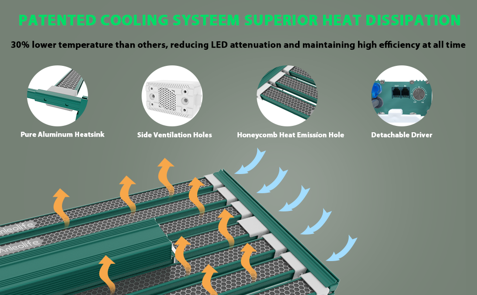 - No. Anleolife’s bar style grow light design and pure aluminum heat sinks contribute to better airflow, hot and cold self-circulating ventilation system on both sides with honeycomb holes design for efficient heat dissipation. Equipped with detachable driver and long power cord 9.8 ft, it can reduce the ambient heat in the growing space, with 30% higher cooling effect than other LED lights, thus no need of extra cooling.