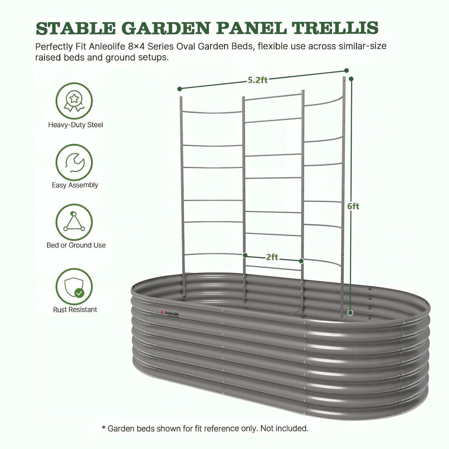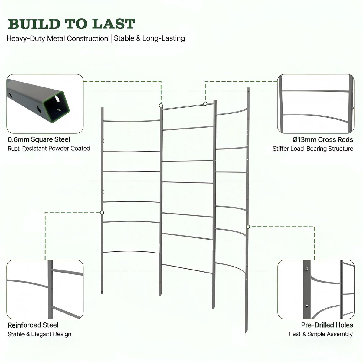 Constructed with reinforced steel panels and horizontal bars to provide strong, dependable support for climbing vegetables and flowers.
