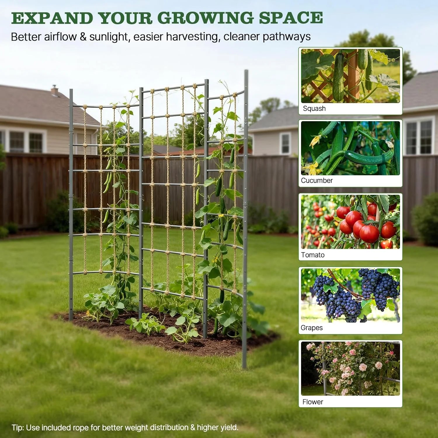 Encourages plants to grow upward, improving airflow, sunlight exposure, and overall garden productivity.