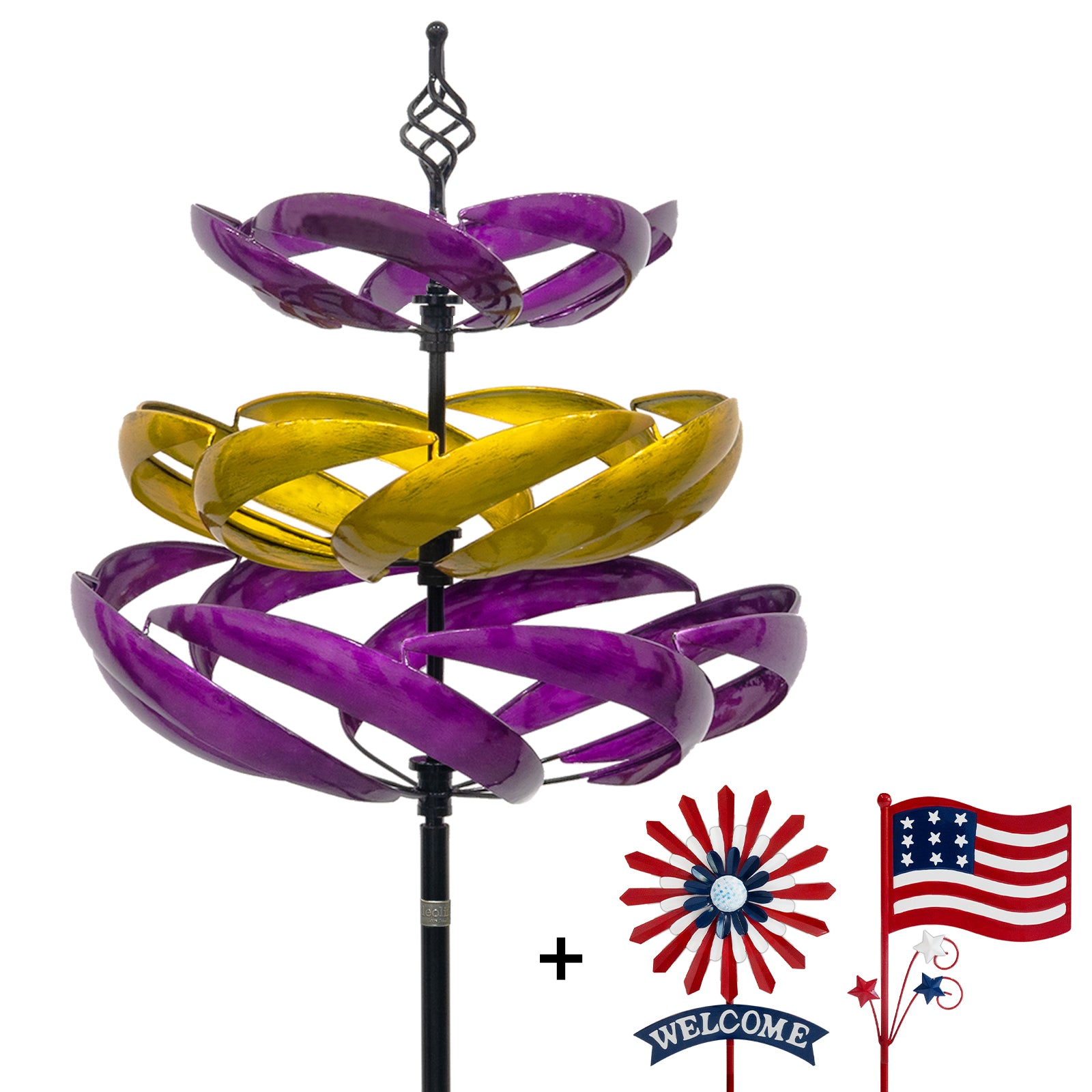 Stands 77" tall (adjustable) with a 21.5" diameter. Includes a 10"×36" welcome sign and a 10.5"×36" decorative flag for a charming garden display
