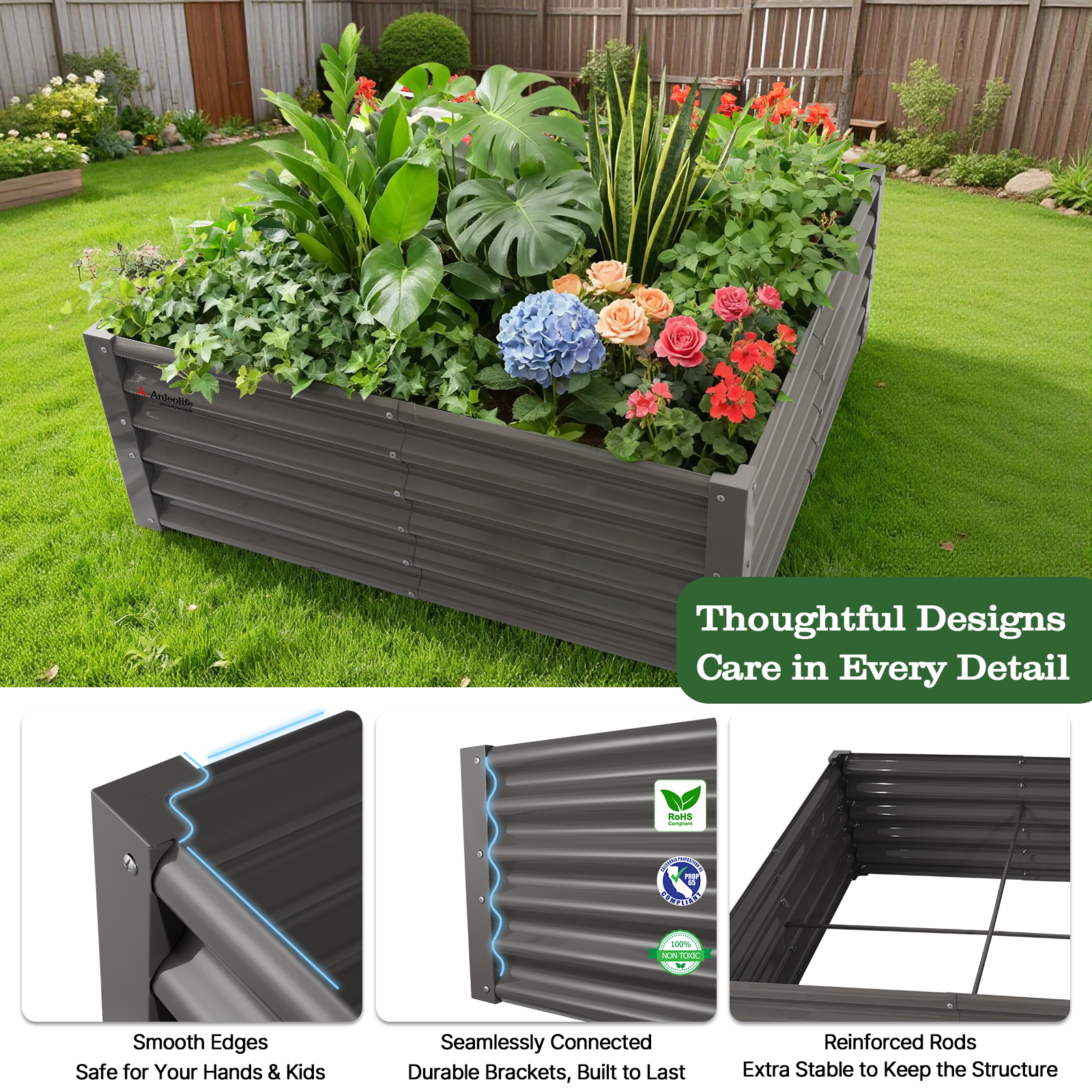 Rest assured that when you choose Anleolife metal garden beds, you are selecting a high-quality, safe, and eco-friendly option for your gardening needs. You can confidently use our garden beds for various gardening needs without any concerns.