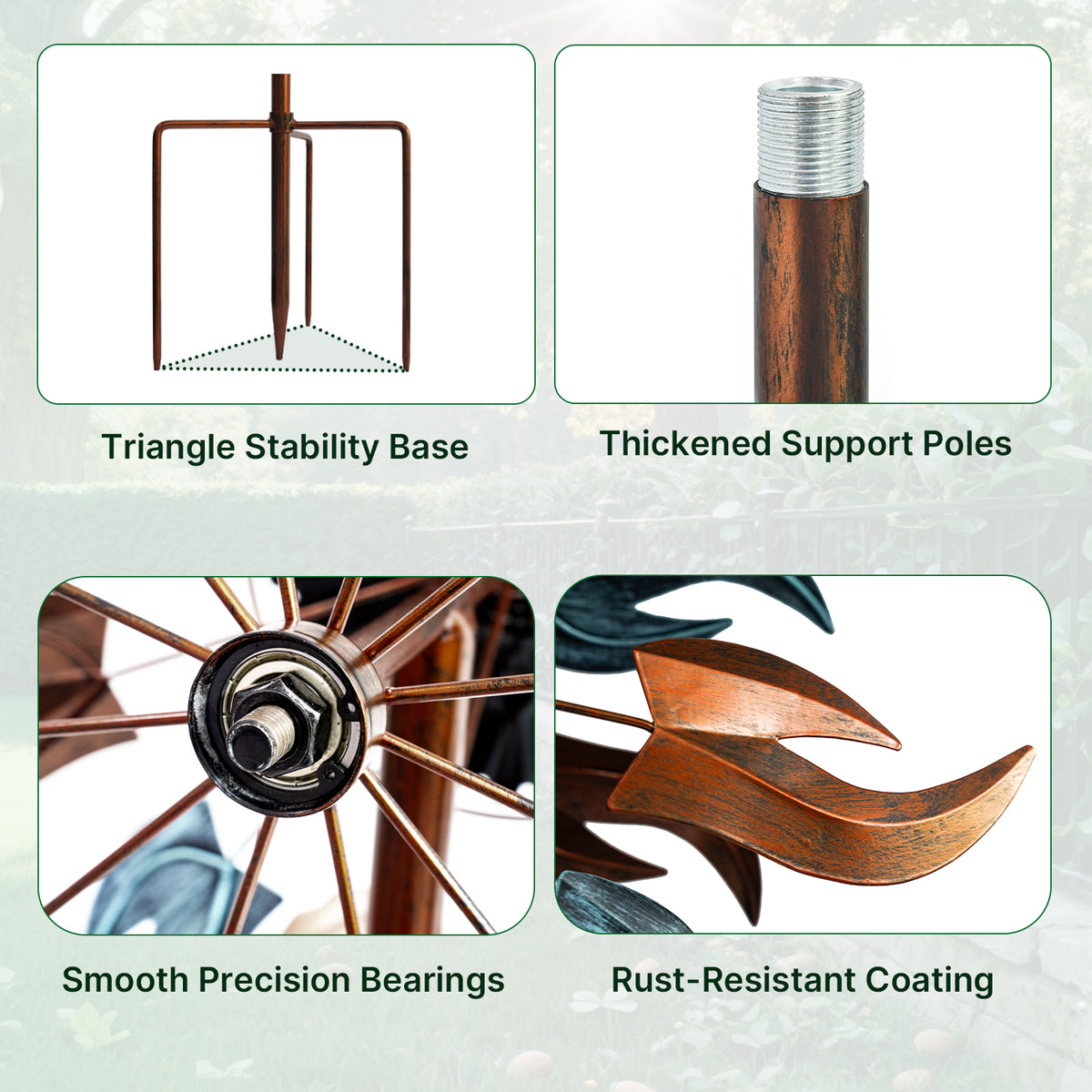 Featuring a vibrant blue flame–inspired double-spinner blade design, it rotates smoothly in the breeze to create a captivating kinetic art display in your garden