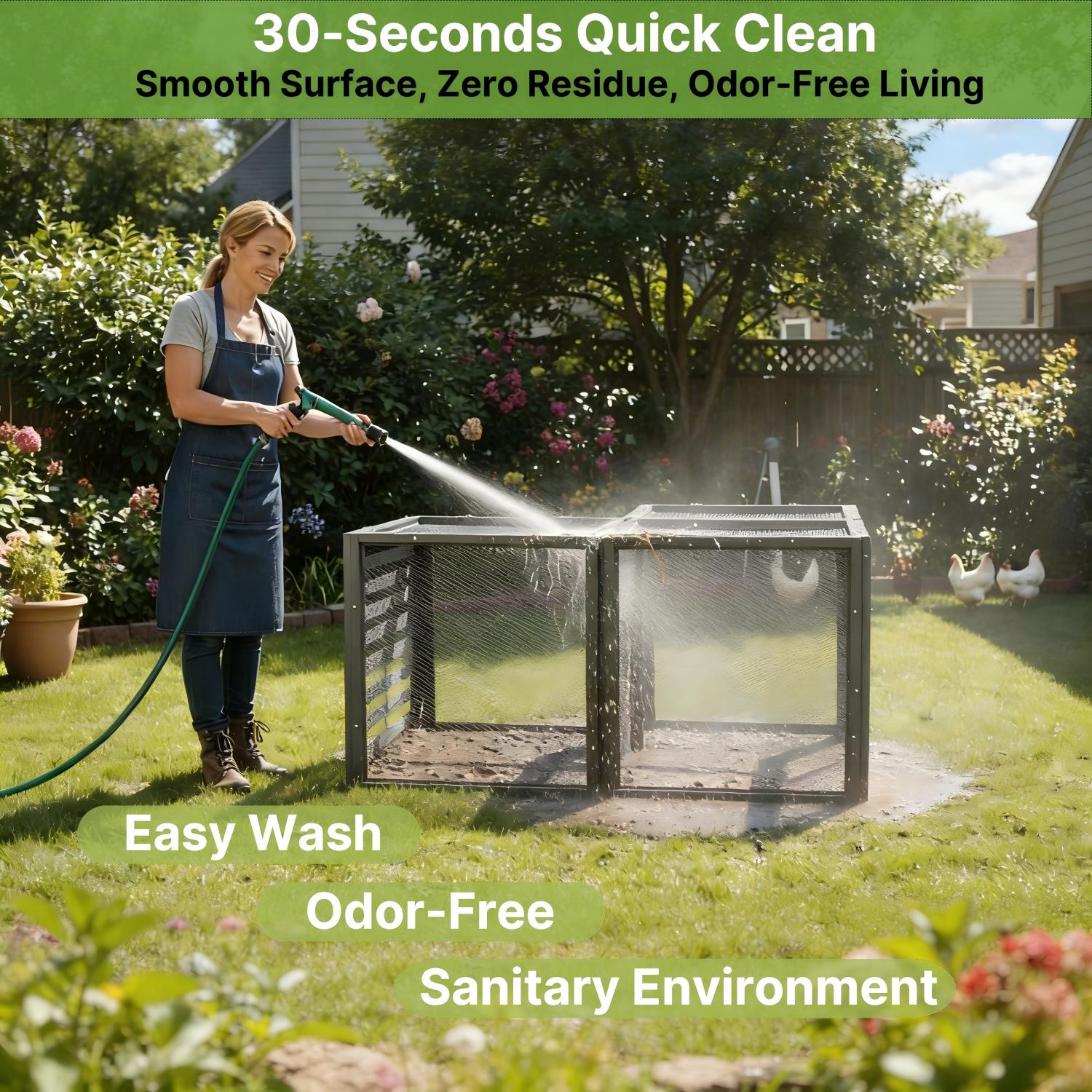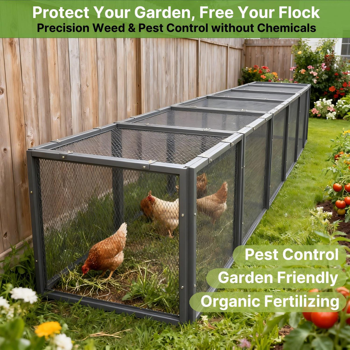 The bottomless design lets chickens forage directly on grass and soil, helping control weeds and insects while keeping poultry entertained.